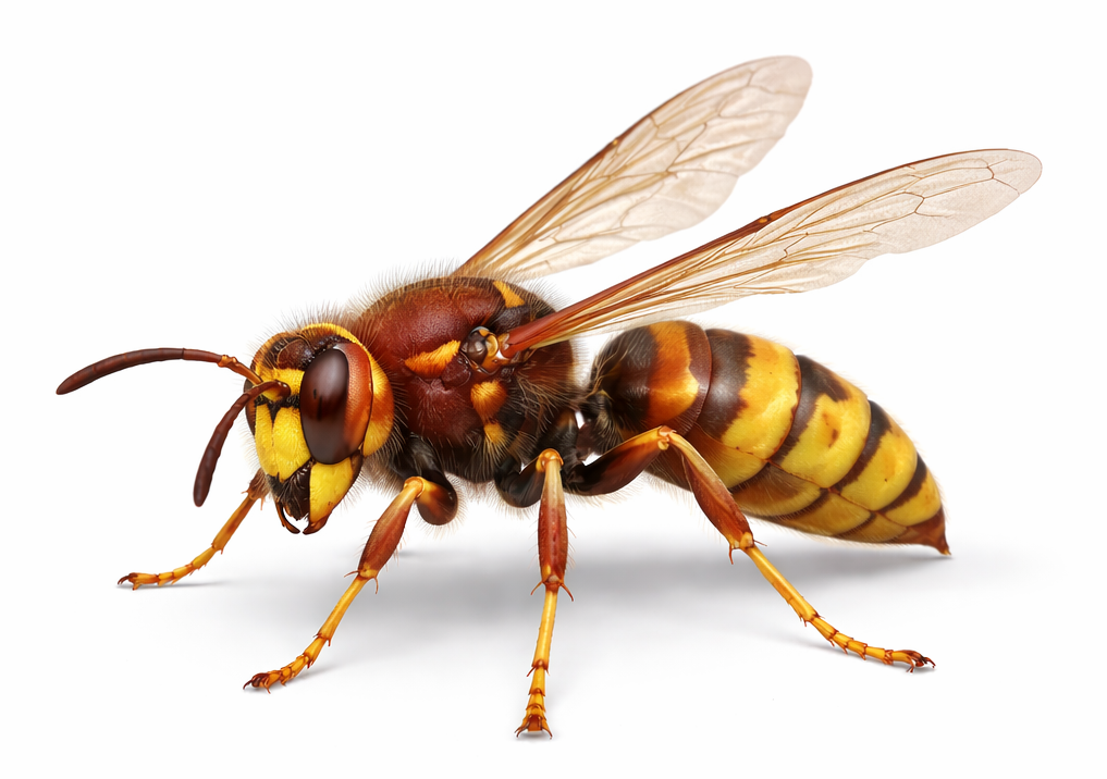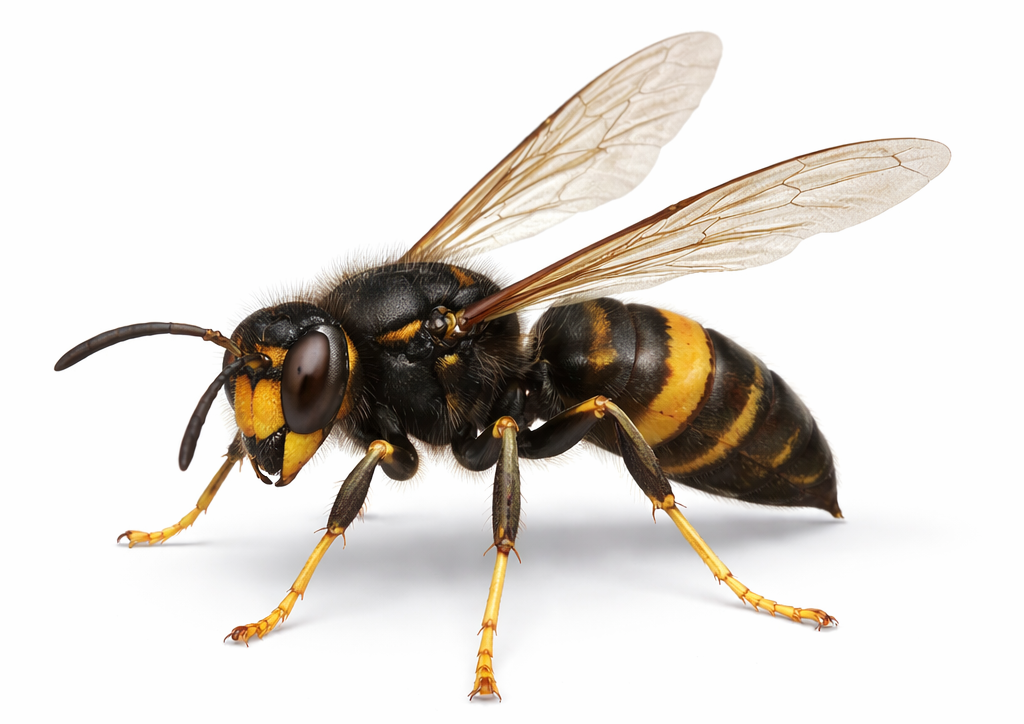 Plus petit et plus foncé que l'européen (Thorax noir, patte jaunes). Très agressif en groupe si on s'approche du nid. Nids souvent énorme en haut des arbres ou sous les toits. Danger prioritaire.